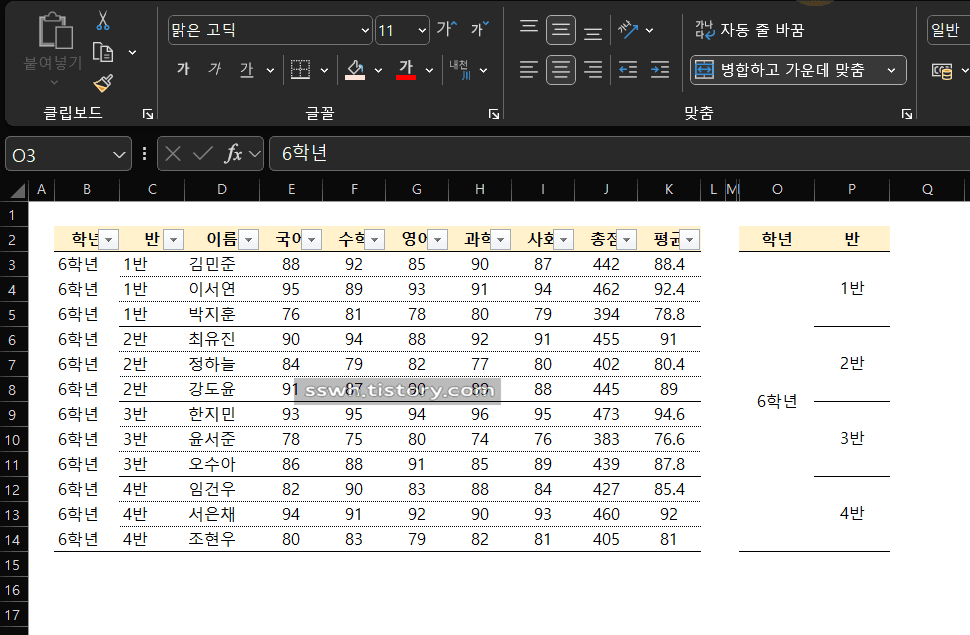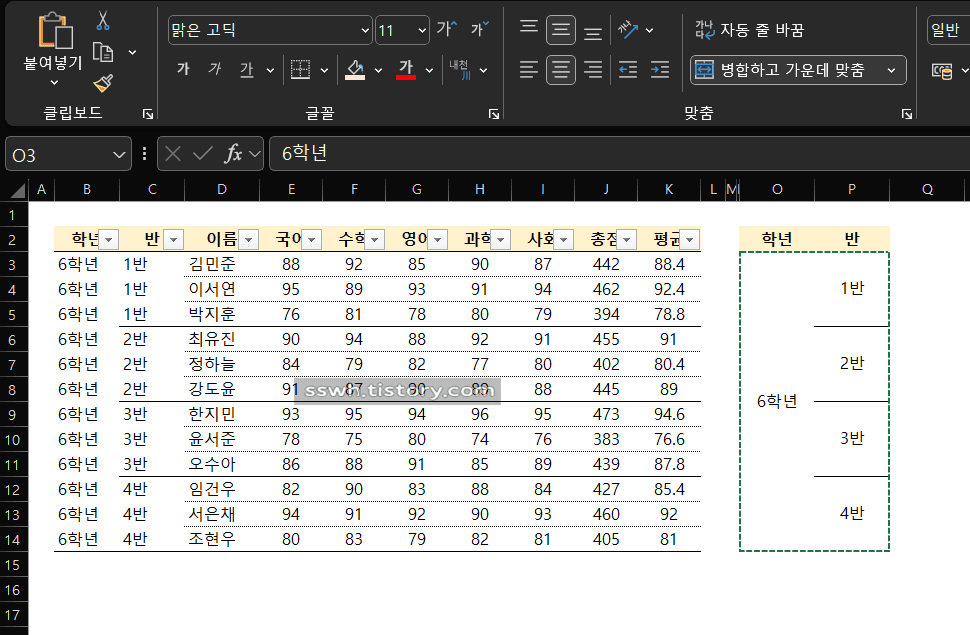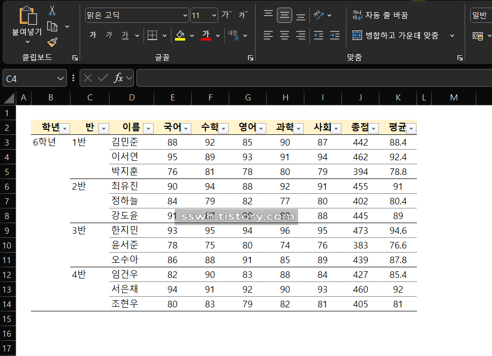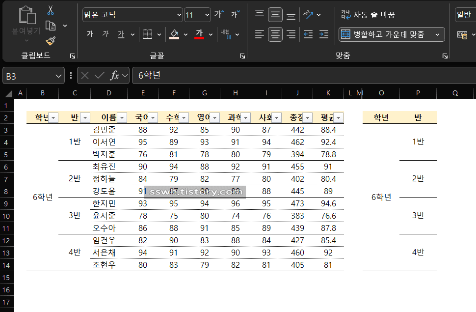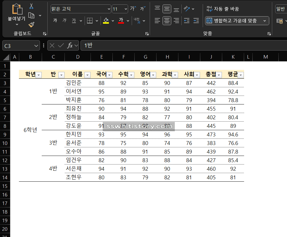 C열에 학급별로 병합된 셀이 보입니다.
