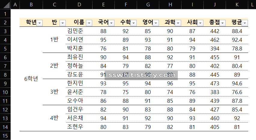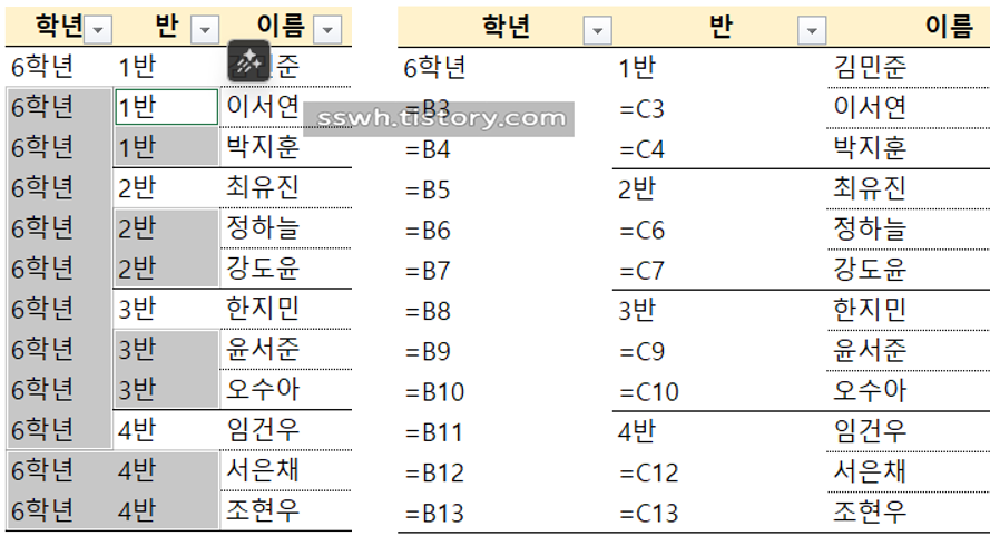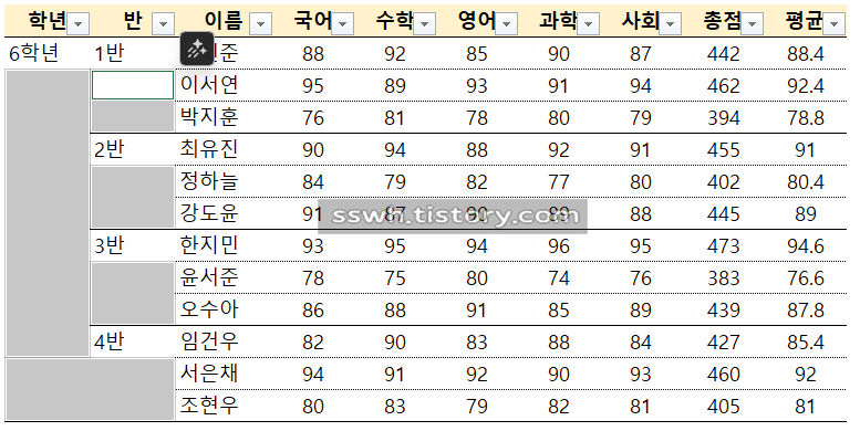 정상적으로 빈셀이 선택되었다면 아래 이미지처럼 학년과 반의 빈 셀이 모두 선택된 모습을 볼 수 있습니다.