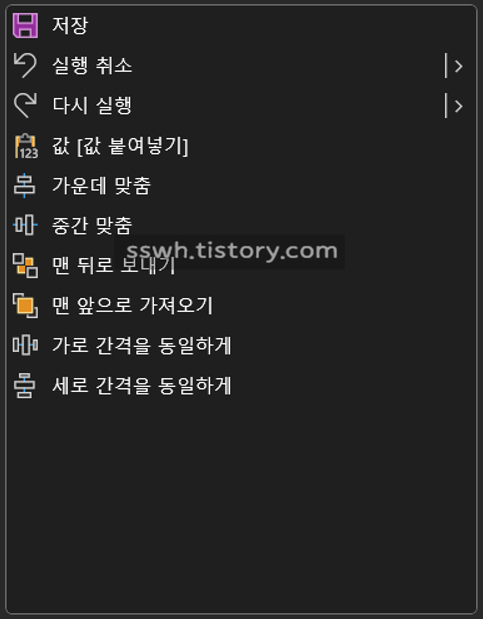보통은 해당 개체 선택 후 우클릭이나 리본 메뉴를 사용하여 수행합니다.