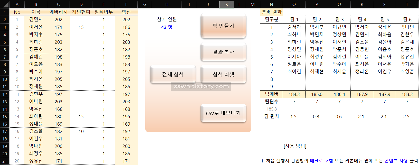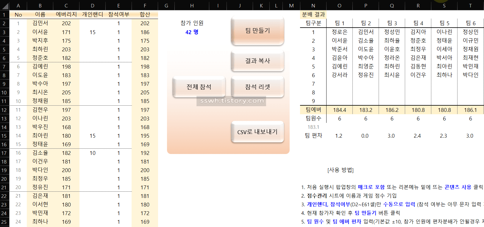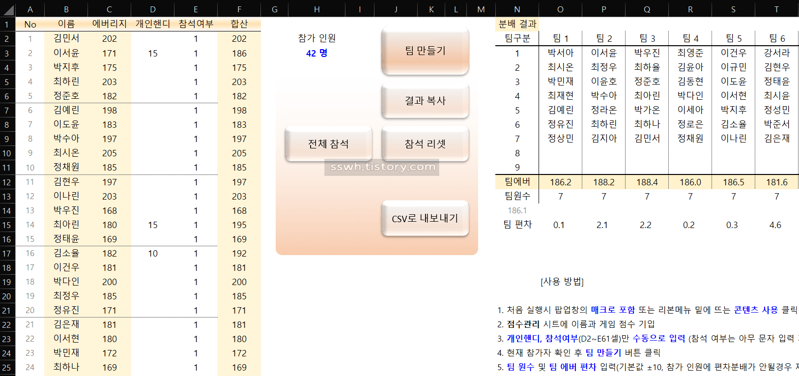 - 엑셀 (VBA) 파일 : 정기전 점수 관리, 참석자 에버리지 기반 팀 분배, 분배 결과 캡처 기능, CSV 내보내기 등