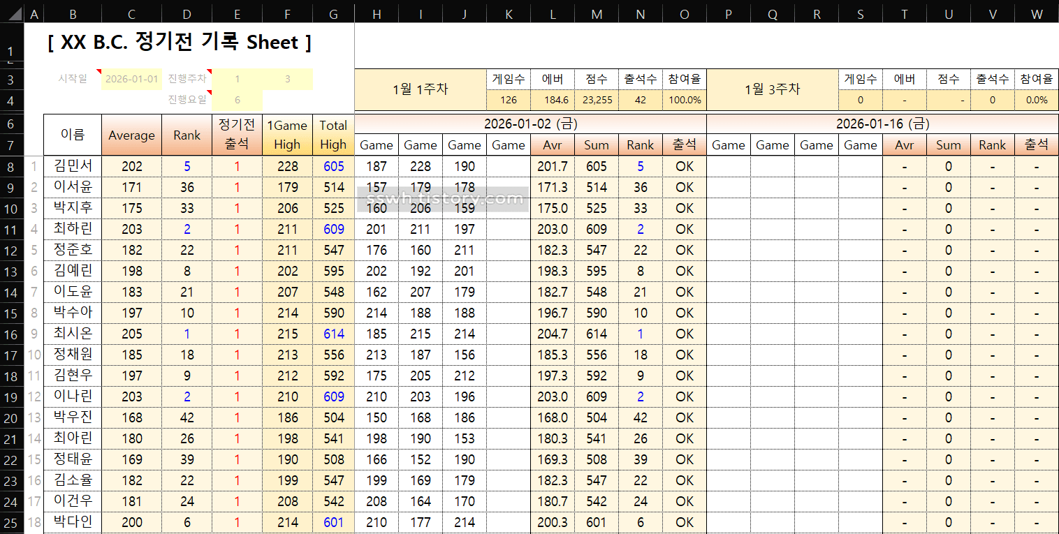 - 이름 및 게임 점수 : 회원 명단 기입 후 주차별 게임 점수 입력 (최대 4게임까지 입력, 필요시 셀추가 가능)