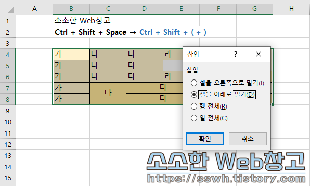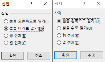 Ctrl + Shift + (+)는 삽입을, Ctrl + (-)는 삭제를 실행하는 단축키입니다. 단일 셀 또는 일정 범위를 선택한 경우에는 별도의 팝업창으로 아래와 같은 상태로 출력됩니다.