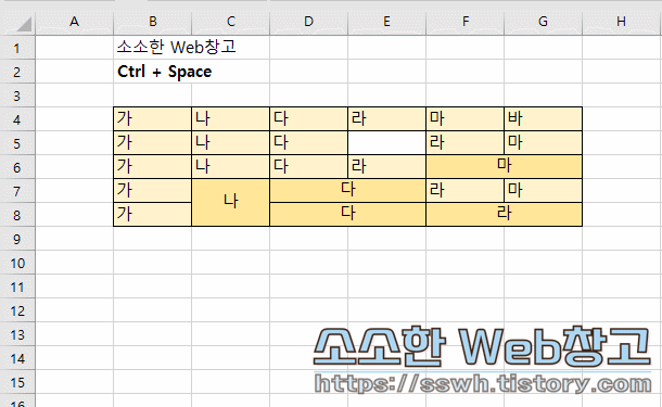 - 범위 영역 내에서 범위 선택이 진행되면 Ctrl + Shift + Space를 한 번 더 누를 경우, 시트 전체 선택으로 변경.