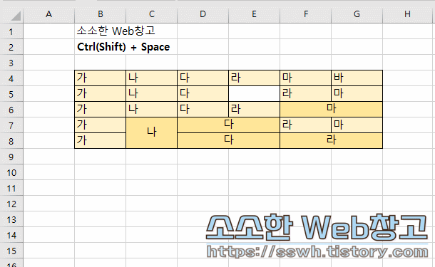 - 선택된 셀을 기준으로 상/하/좌/우 내용이 끊이지 않고 연속되는 범위만큼 자동 선택.