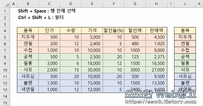 □ Shift + Space, Ctrl + Shift + L : 행 전체 선택 후 필터 적용