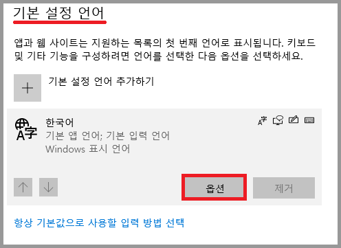 step 2. 언어 항목의 세부 내용 중 기본 설정 언어 한국어를 클릭한 후 옵션을 클릭한다.