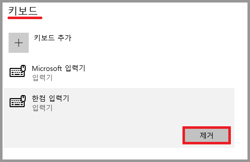 step 3. 언어 옵션 : 한국어 창이 열리면 하단의 키보드 항목에서 한컴 입력기 클릭 후 제거를 클릭한다.