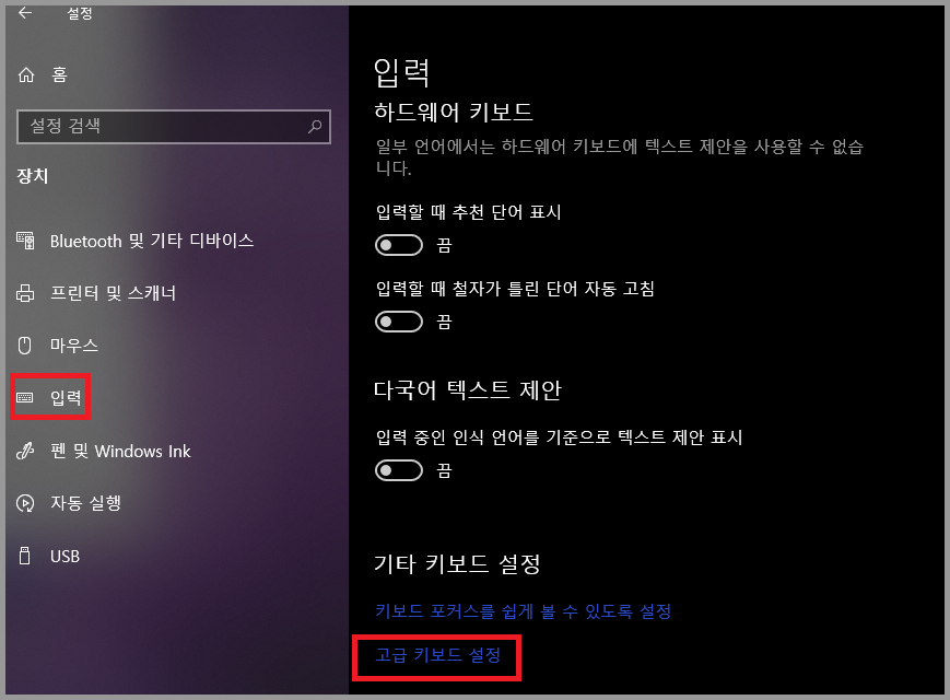 step 2. 기타 키보드 설정 항목의 고급 키보드 설정을 클릭한다.