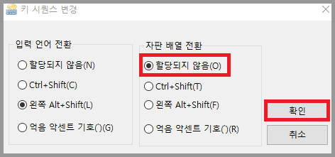 step 5. 자판 배열 전환 항목의 할당되지 않음을 체크한 후 확인을 클릭한다.