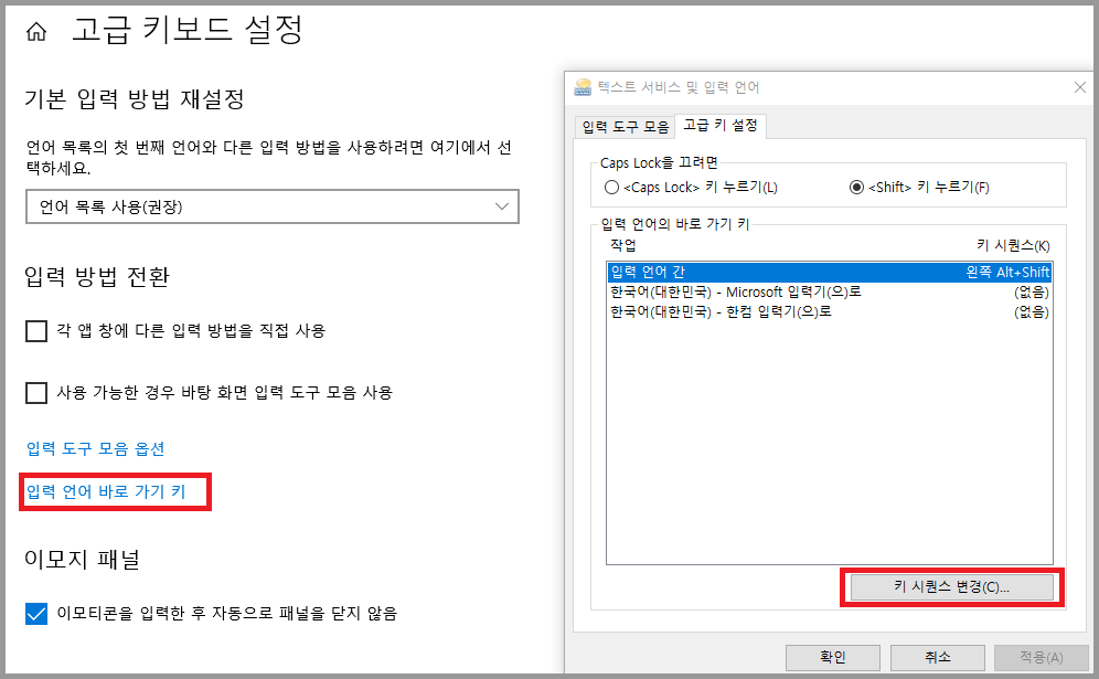 step 3. 입력 방법 전환 항목의 입력 언어 바로 가기 키를 클릭한다.