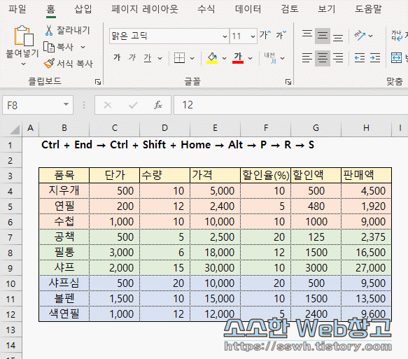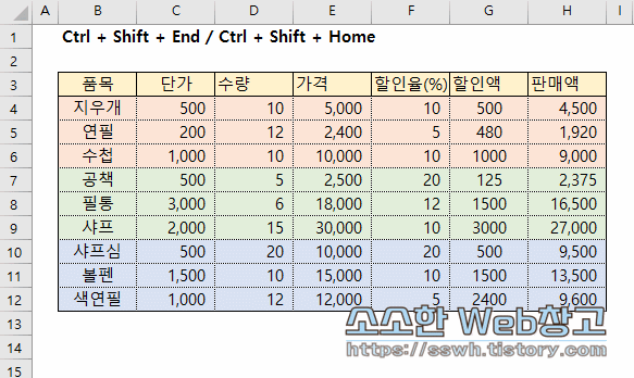 이를 응용하여 Ctrl + Home → Ctrl + Shift + End 혹은 Ctrl + End → Ctrl + Shift + Home의 순으로 사용하면 데이터 영역 전체를 선택할 수 있습니다.