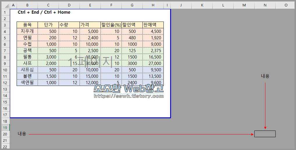 N열과 20행에 무언가의 내용이 있다면 Ctrl + End를 눌렀을때 N20셀로 이동하게 된다는 의미입니다.