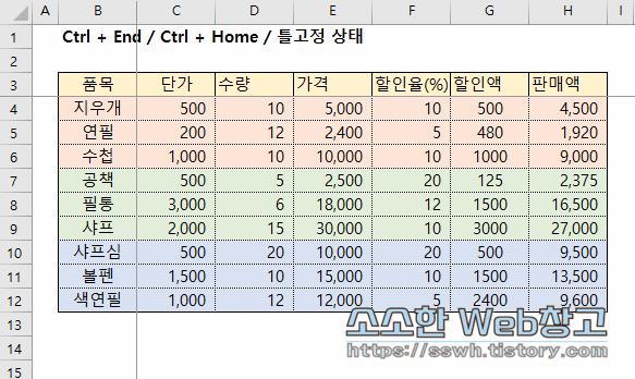 다만 틀 고정이 적용된다면 처음 틀 고정을 실행하기 위해 선택했던 셀이 시작 셀이 됩니다. 아래 예시 화면의 경우에는 Ctrl + Home을 누르면 C4셀로 이동합니다.