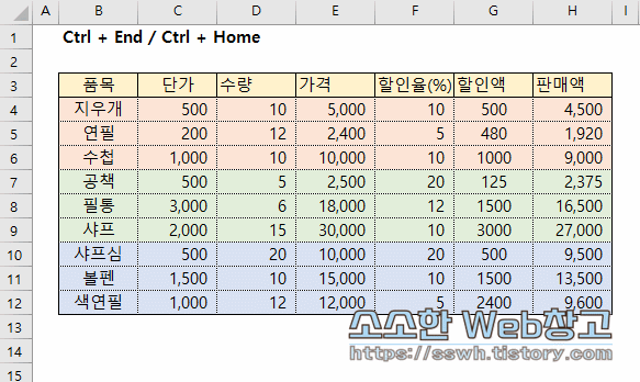 Ctrl + Home, Ctrl + End : A1셀부터 ~ 데이터 영역 마지막 셀의 빠른 이동