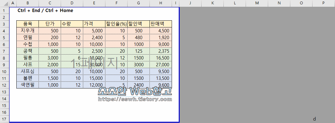 통상적인 경우, Ctrl + Home은 A1셀로 이동을, Ctrl + End는 데이터 영역의 마지막 셀로 이동합니다.