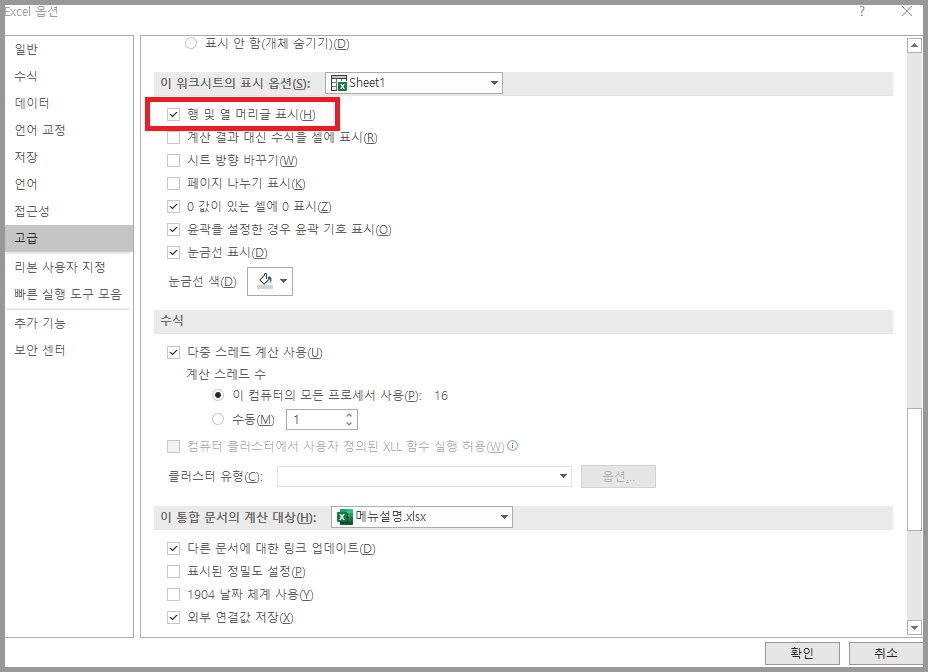 ② 파일 → 옵션 → 고급 → 이 워크시트의 표시 옵션: '행 및 열 머리글 표시' 체크하기