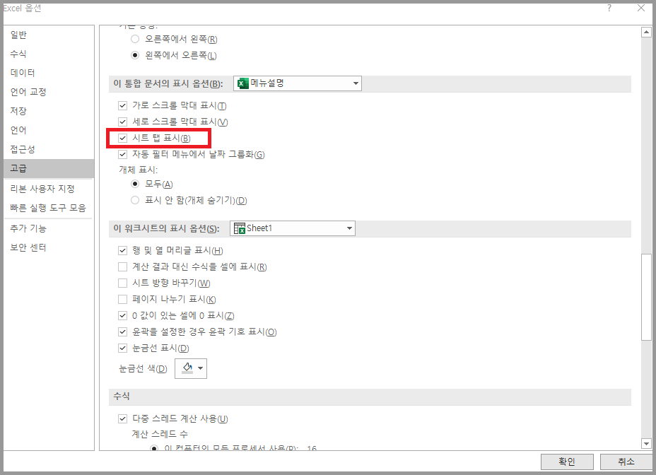 파일 → 옵션 → 고급 → 이 통합 문서의 표시 옵션: '시트 탭 표시'를 체크하면 시트 탭이 정상적으로 표시됩니다.
