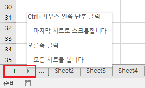 시트가 한 화면에 모두 들어오지 않을 정도로 여러 개가 만들어져 있을 때 그림과 같이 시트 이동 버튼이 활성화 됩니다. 마우스를 올려보면 간단한 팝업 도움말이 출력됩니다.