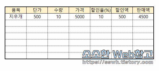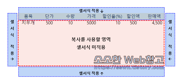 그럼 앞서 예시 화면에 사용되었던 표를 다시 보겠습니다. 위의 설명대로 복사를 사용하는 영역과 맞닿아 있는 셀들의 접촉 변에만 테두리를 넣어주면 됩니다.