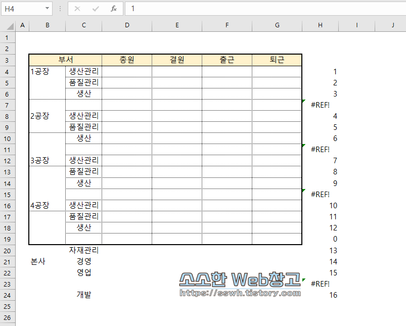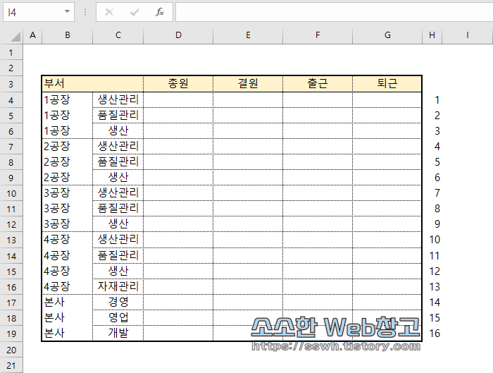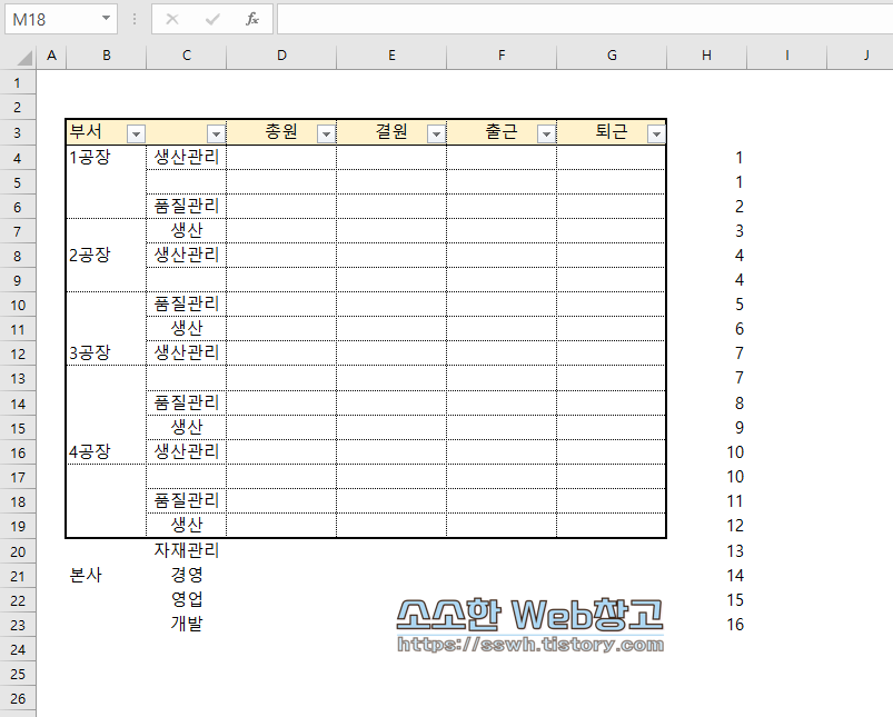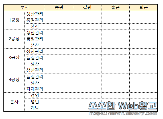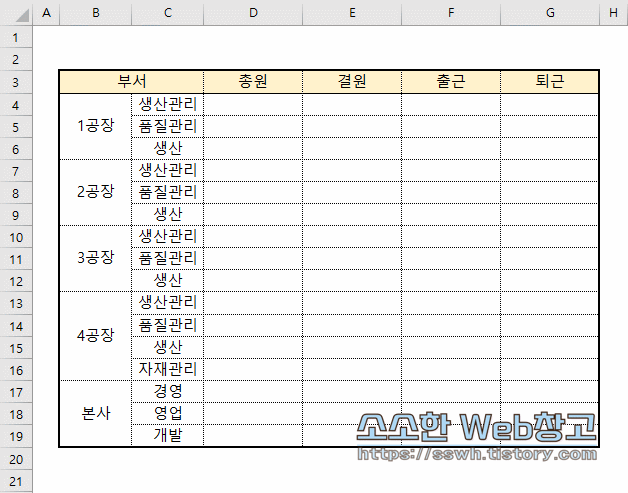 이번에는 다음과 같이 각 공장별 부서현황이 있다고 했을 때 신설 부서를 생산파트 밑에 추가한다는 가정을 해보겠습니다. 방법은 앞서와 같습니다. 다만 이번 양식은 병합된 셀이 보이는군요. 먼저 셀병합부터 모두 해제해주셔야 합니다.