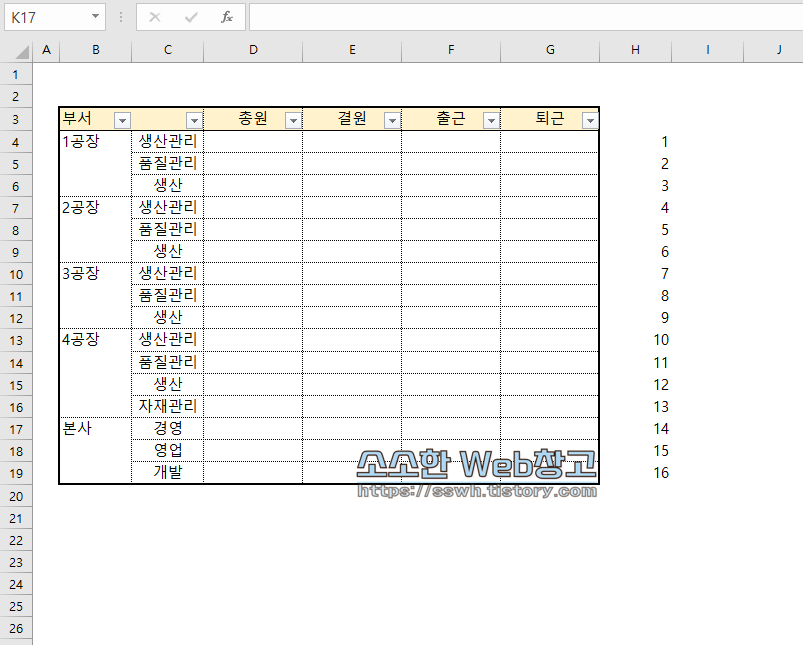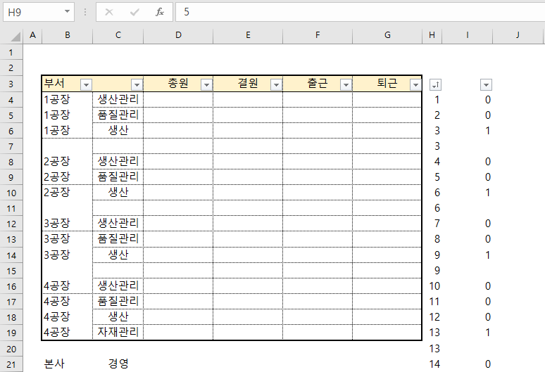 필터링을 해제한 후 마찬가지로 숫자열 기준으로 정렬을 진행하면 예시 화면과 같이 생산관리파트 밑에만 빈 행이 추가되어 있는 것을 볼 수 있습니다.