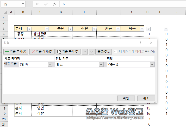 ⑤ 메뉴 → 데이터 → 정렬을 실행하여 정렬기준을 숫자가 위치한 열로 지정하고, 확인을 누른다.