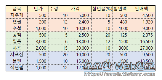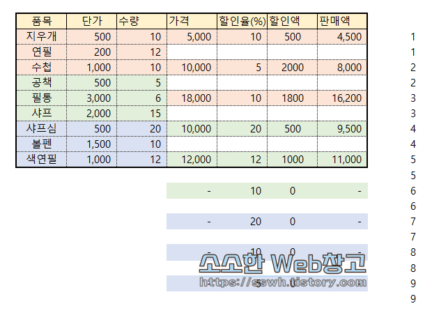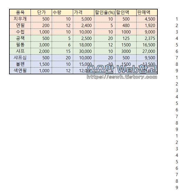 ② 각 품목마다 채우기핸들을 사용하여 숫자를 채워준다.