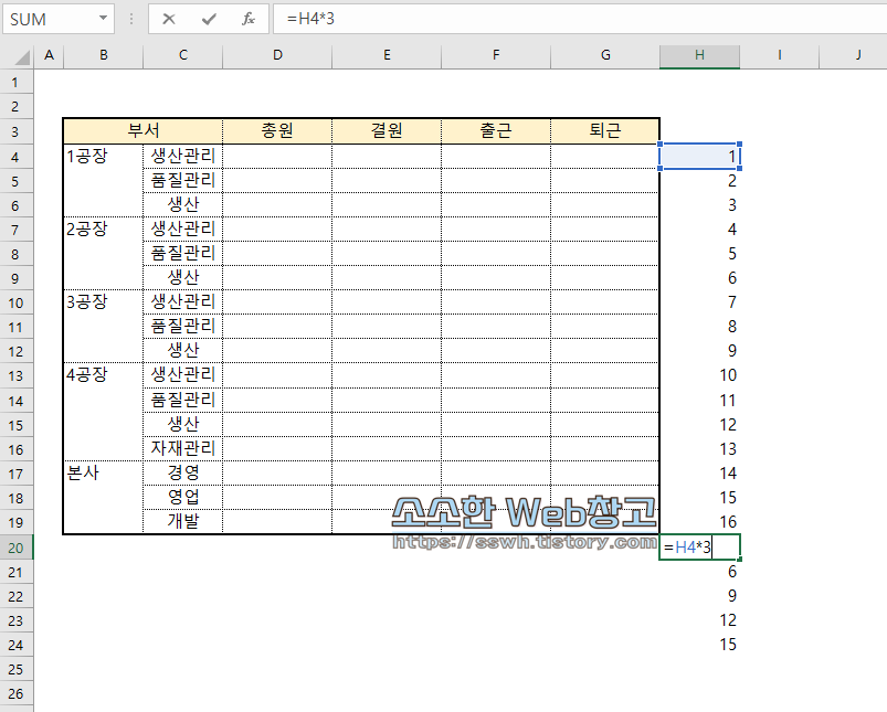 H4 * 3 ← H4셀의 값, 즉 1에 3을 곱해주는 수식을 입력