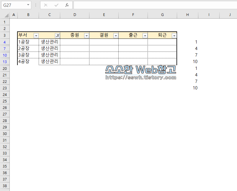 그리고 숫자를 복사하지마시고, 양식을 다시 봐주시기 바랍니다. 위의 양식을 잘 보시면 생산파트의 위치는 3의 배수의 위치마다 반복되고 있습니다.