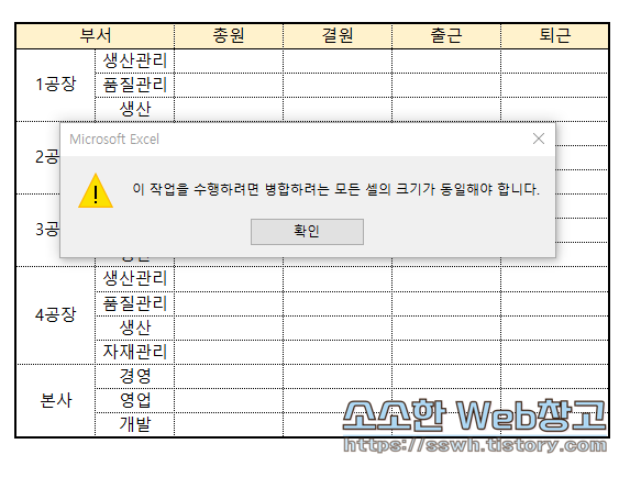 만약 정렬 범위 내에 병합된 셀이 있다면 다음과 같은 경고와 함께 정렬이 진행되지 않습니다.