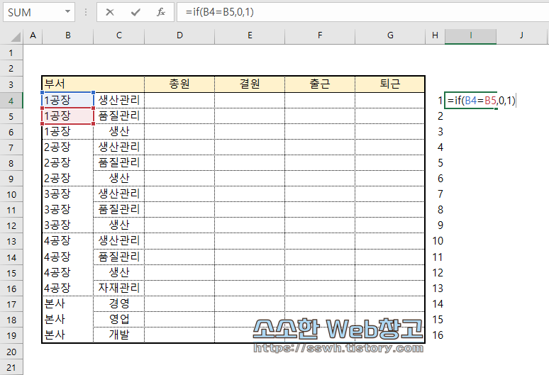 ⑦ 부여된 숫자 중 1 옆에 '=if(B4=B5,0,1)'를 입력한다.