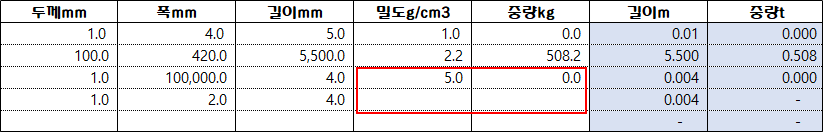 회사에서 소재의 중량과 두께, 길이, 폭, 밀도(혹은 비중)를 이론 상으로 계산해야할 때가 가끔 있었습니다.