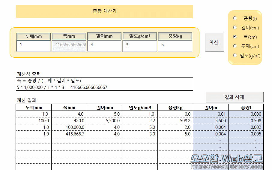 과거 무게 = 부피 x 밀도라는 공식을 이용한 엑셀 VBA 기반의 계산 파일을 만든 적이 있었습니다. https://sswh.tistory.com/38 [VBA] 두께 길이 폭 밀도 중량 계산기안녕하세요. 뜨란입니다. 회사에서 소재