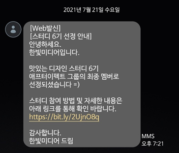 마침내 스터디 6기 선정 안내 문자도 도착했습니다.