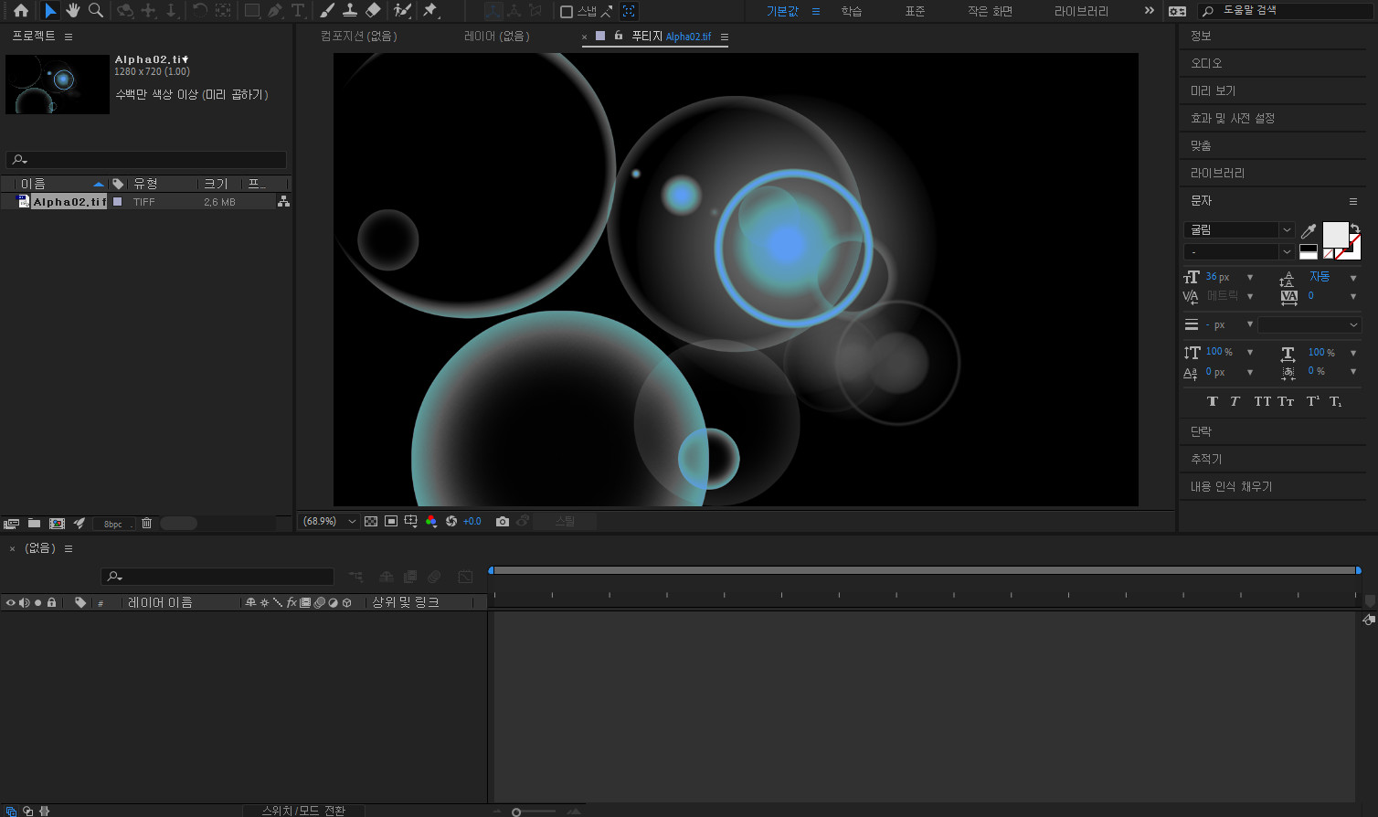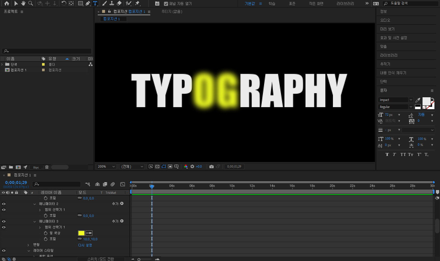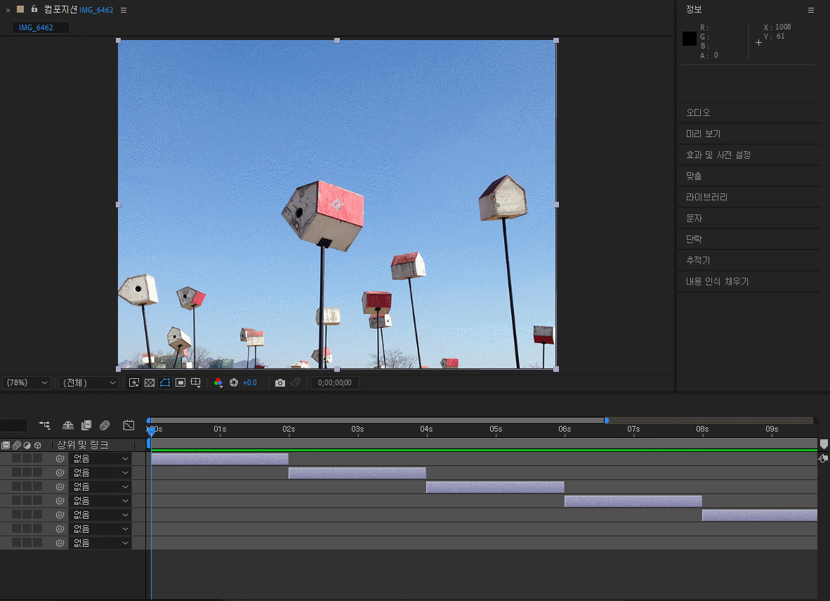 2주차부터 본격적으로 무언가 배운다는 생각이 들기 시작합니다. 교재대로 따라가다보면 어느새 간단한 애니메이션이 만들어져 있는 것을 볼 수 있게 됩니다. 레이어나 컴포지션 패널 등이 조금씩 익숙하게 와닿는 시기였습니다.