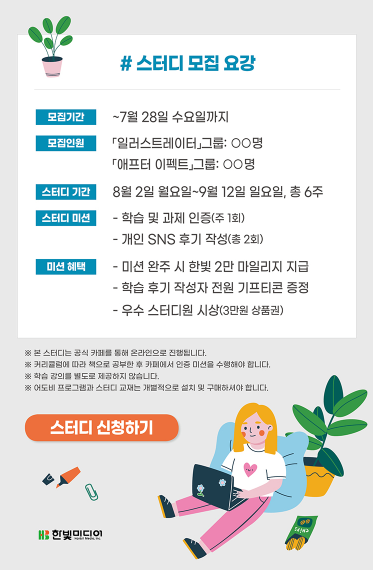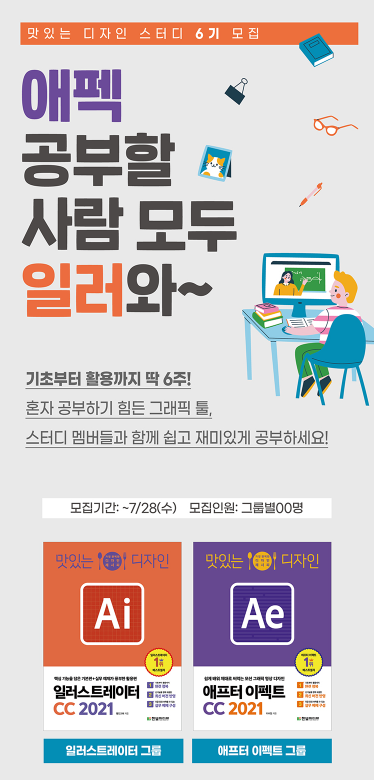 평소 IT 관련 서적을 살 때 자주 이용하는 한빛출판네트워크로부터 어느날 한 통의 메일이 날아왔습니다. 생각없이 읽고 있었는데 애프터 이펙트와 일러스트레이터 6주 완성 스터디 참여자를 모집한다는 내용이 눈에 확 띄었습니다.