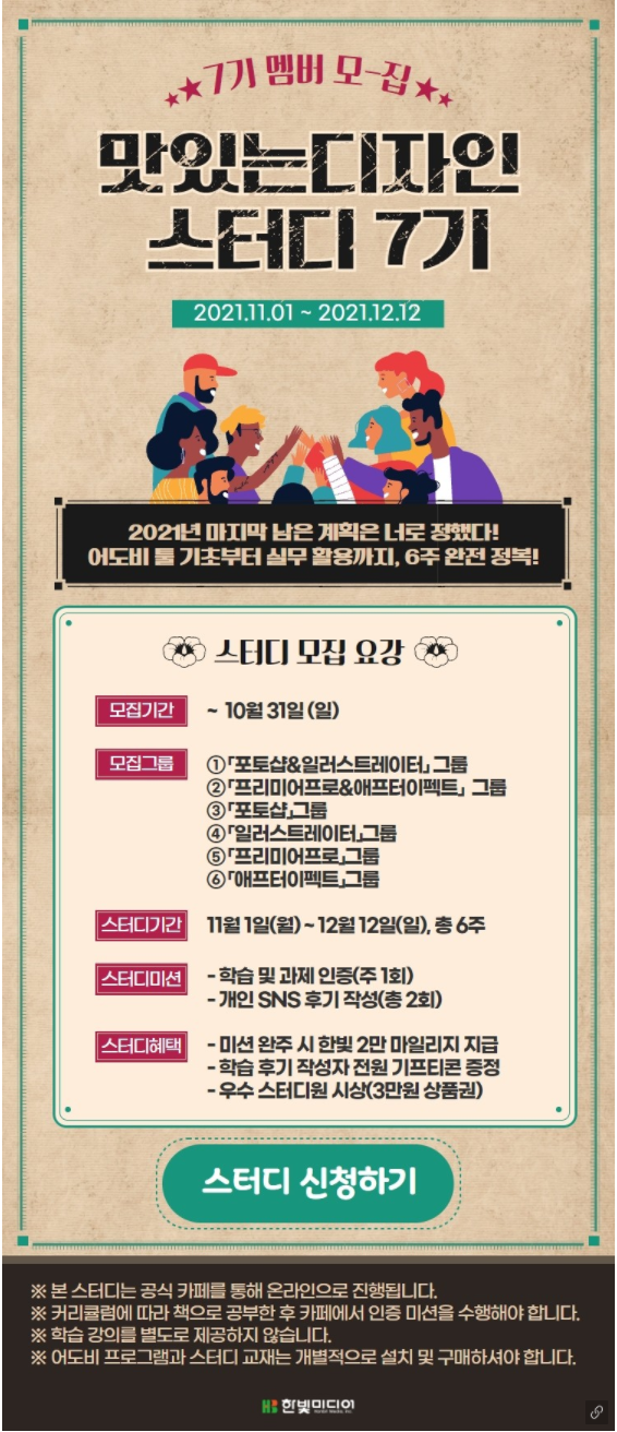 지난 8월~9월 사이 진행했던 맛있는 디자인 애프터이펙트 스터디 6기 과정을 마치고 약 한 달 정도 지나서 7기 모집글이 게시되었습니다. 이미 원하는 과목을 정해놓았던지라 망설임 없이 7기 스터디에 지원했습니다.