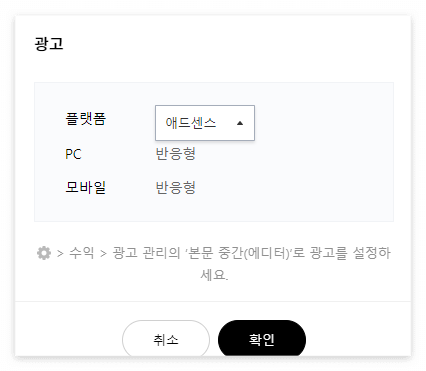 HTML 편집없이 스킨 관리 메뉴에서 직접 광고를 적용할 수 있는 부분이 편할 것 같아서였는데요.