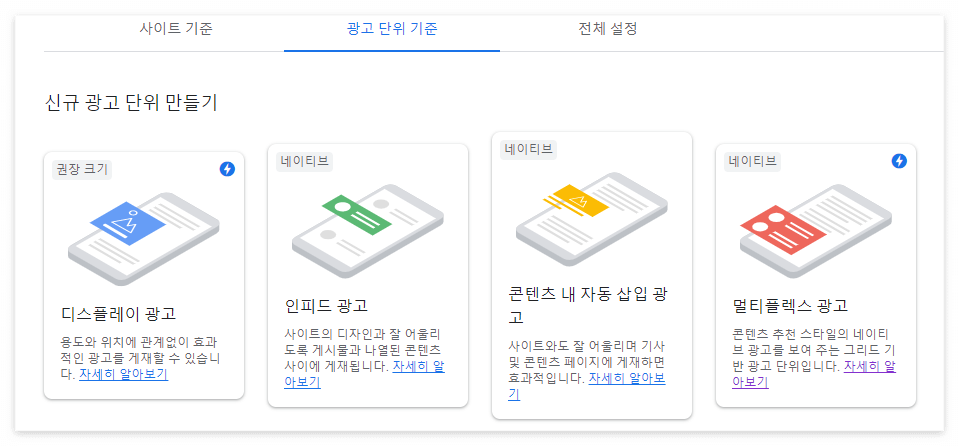 우선 애드센스에 로그인하여 광고 - 광고 단위 기준에서 멀티플렉스 광고를 선택한 후 만듭니다.