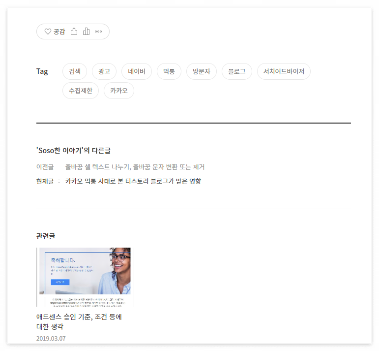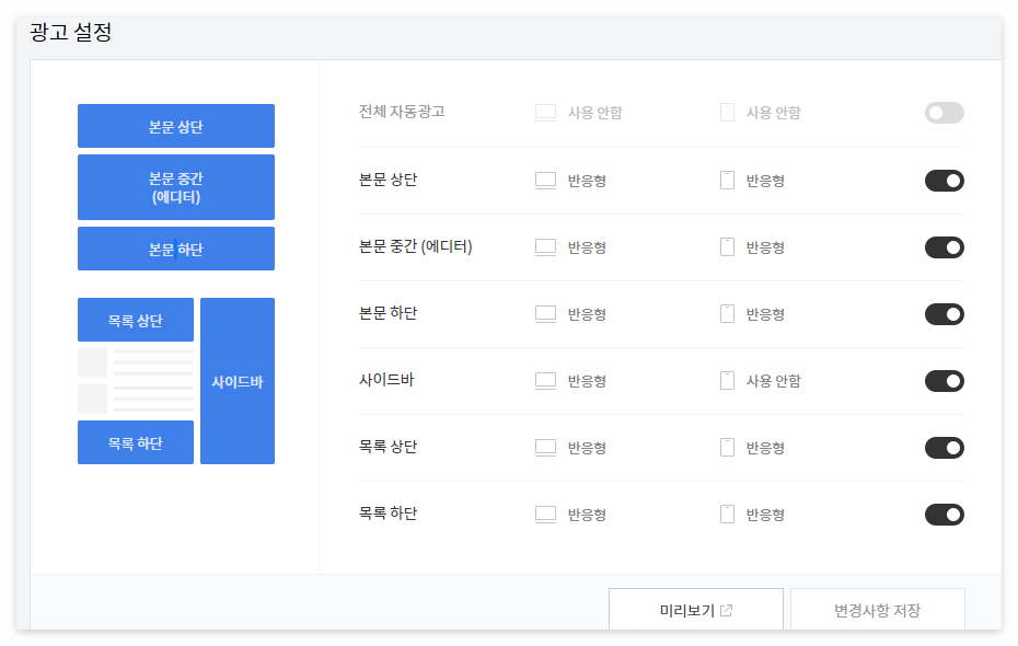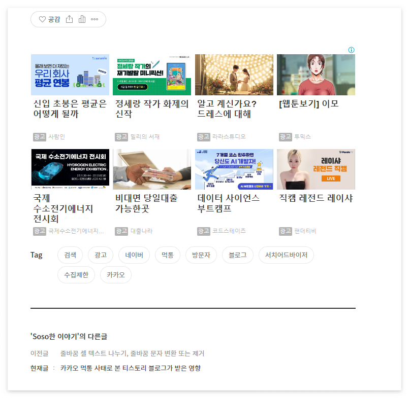 다만 본문 중간 광고는 글쓰기 에디터에서 개별 설정하거나 HTML 편집 영역에 별도의 구문을 추가해둬야한다고하는데 이부분을 손을 댈지는 고민 중이긴 합니다.