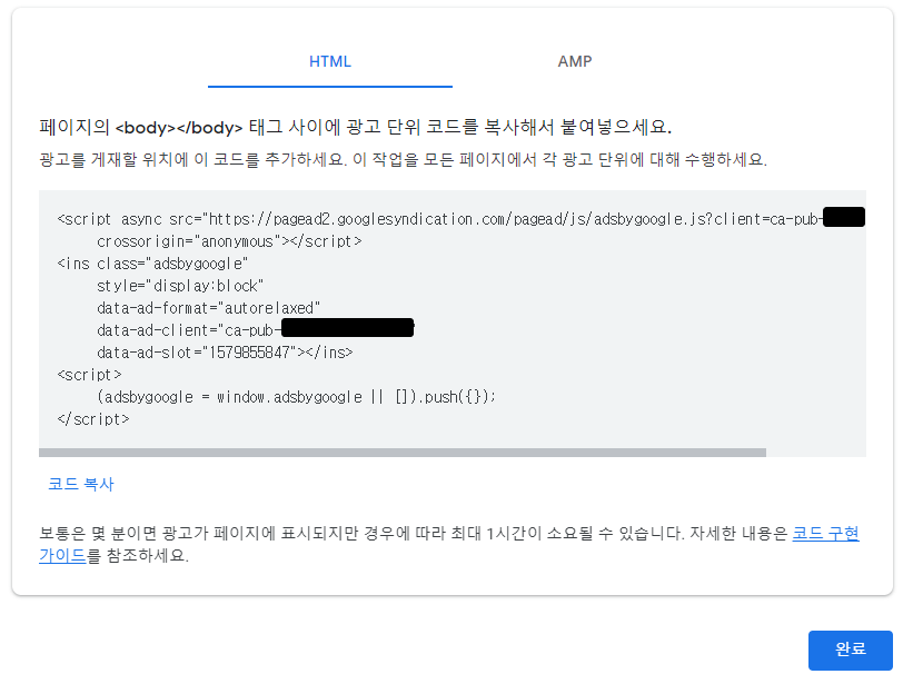 저는 이미 광고 단위가 만들어져 있어 즉시 광고가 출력되었는데 광고 단위를 만든 직후에는 일정 시간 광고 출력이 되지 않을 수 있으니 참고바랍니다.