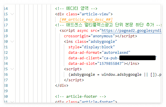 위 이미지를 보시면 217행 ~ 227행까지 앞서 애드센스 홈페이지에서 복사한 광고 코드가 삽입된 것을 알 수 있습니다.