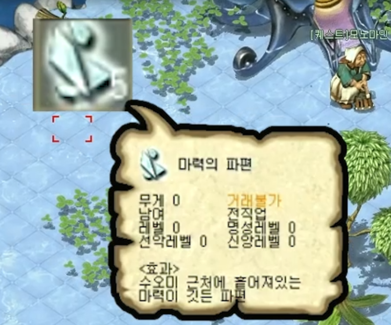 ② 수오미 마을 12시 방향 (85,40) NPC 뷰코크에게 대화를 하여 마력의 파편을 얻어오라는 내용을 확인한다.