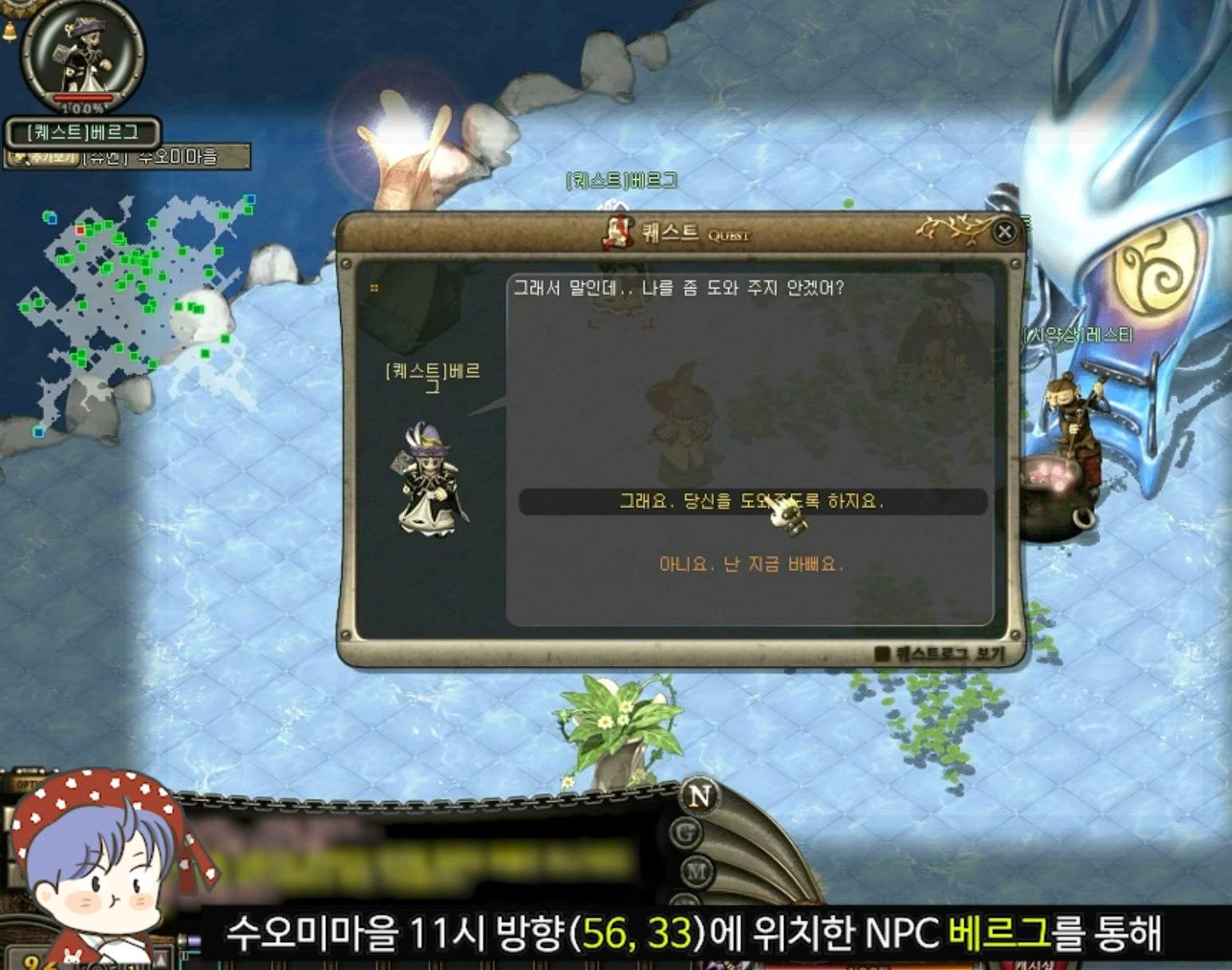 ① 수오미 마을 11시 방향 (56,33) NPC 베르그로부터 퀘스트를 받는다.