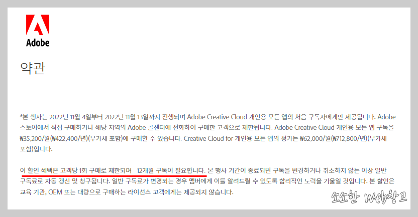 그렇게 사용하다가 11월 초에 어도비코리아 할인 프로모션 정보를 보게 되었습니다. 알아보니 매년 연말과 11월 즈음하여 이렇게 할인 프로모션을 해서 연간 구독자를 확보하는 것 같았습니다.