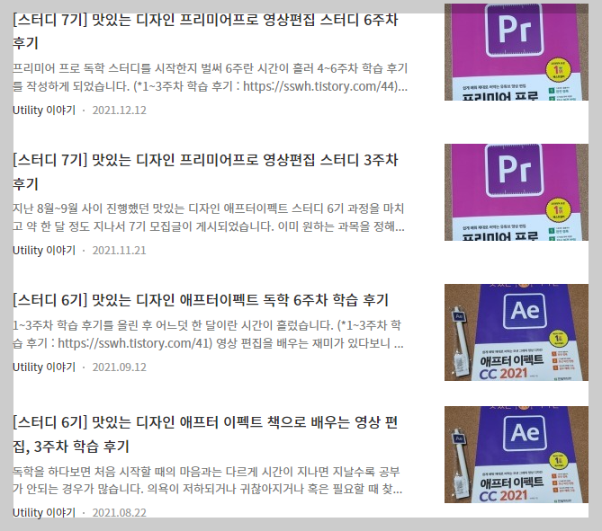 한빛네트워크 출판사에서 진행하고 있는 '맛있는 스터디' 프로모션에 참여하여 프리미어 프로와 애프터이펙트 독학 스터디 후기를 본 블로그에 올리던 때가 한참 이런식으로 단품으로 구독 후 사용하던 시기입니다.