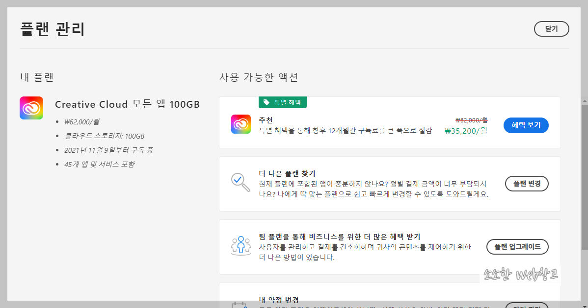그저 갱신일자를 확인하기 위해 어도비 로그인을 했더니 아래와 같은 할인 혜택이 떠 있는 것을 볼 수 있었습니다.