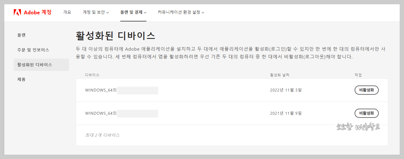 어도비에서는 한 계정당 2대의 디바이스까지 등록하여 사용이 가능합니다.