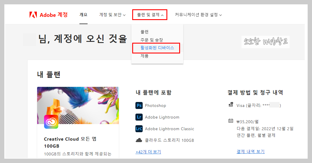 등록 방법은 어도비 웹 로그인 - 프로필 아이콘 클릭 - 계정 보기 - 플랜 및 결제 - 활성화된 디바이스 순으로 이동하여 등록하면 됩니다.