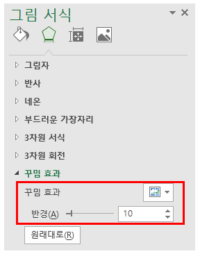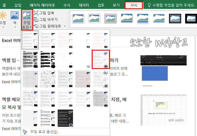 그리고 이미지를 선택한 상태에서 상단 메뉴의 그림 도구 - 서식 - 꾸밈 효과 - 흐리게를 선택합니다.